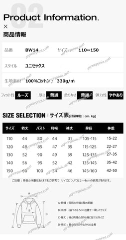 LL BW14キッズ(子供用)プルオーバーパーカーは、11色の330g/㎡の通気性が良く柔らかい綿100%生地の為、学際や運動会の際に良く使われます。